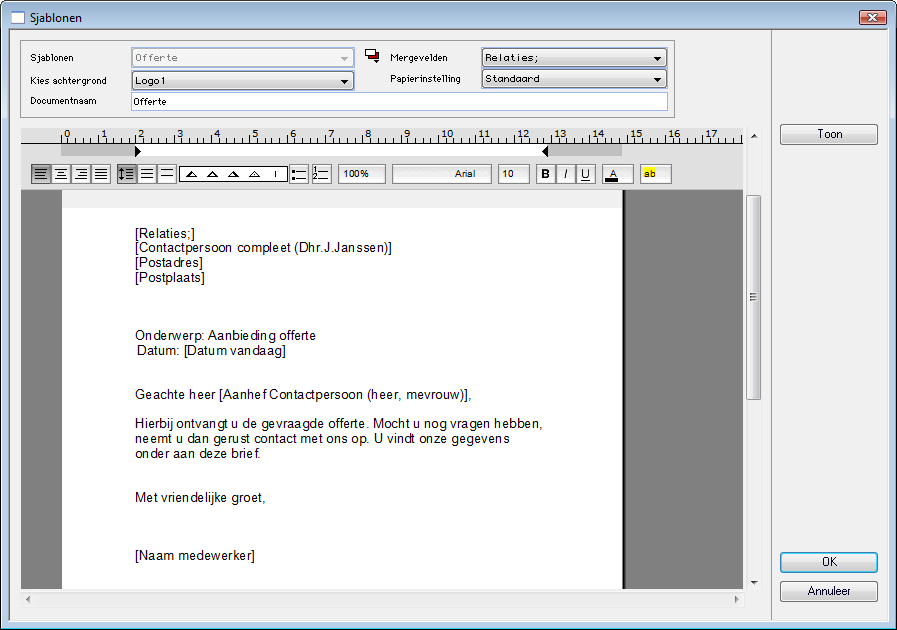 Wanneer de benodigde sjablonen zijn vastgelegd, is het gemakkelijk om met behulp van een intern sjabloon een document te maken dat precies aan uw voorwaarden voldoet. Zie verder Documenten voor een relatie maken en Begeleidend document aan offerte toevoegen.